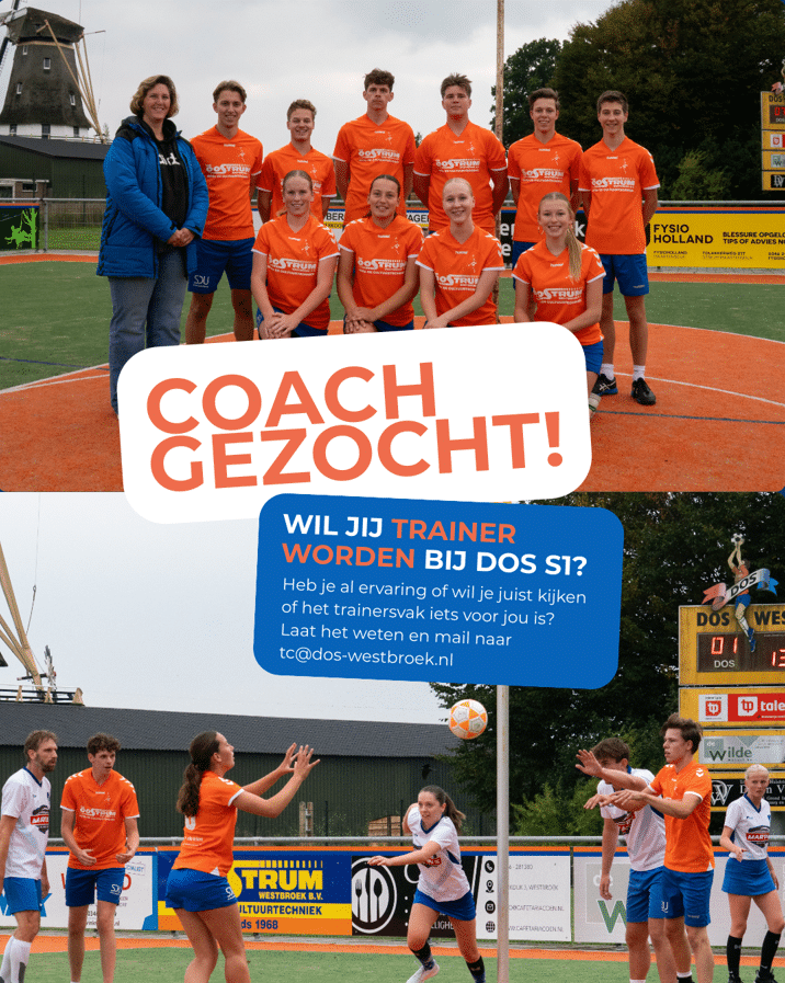 We zoeken een coach voor het jonge, talentvolle en enthousiaste eerste team van DOS. Ben jij een coach met al wat jaren ervaring, of lijkt het je leuk om juist ervaring als coach op te doen? Wij zouden heel graag in gesprek komen. tc@dos-westbroek.nl